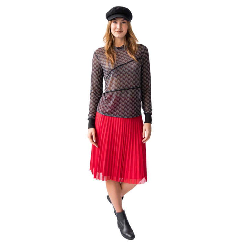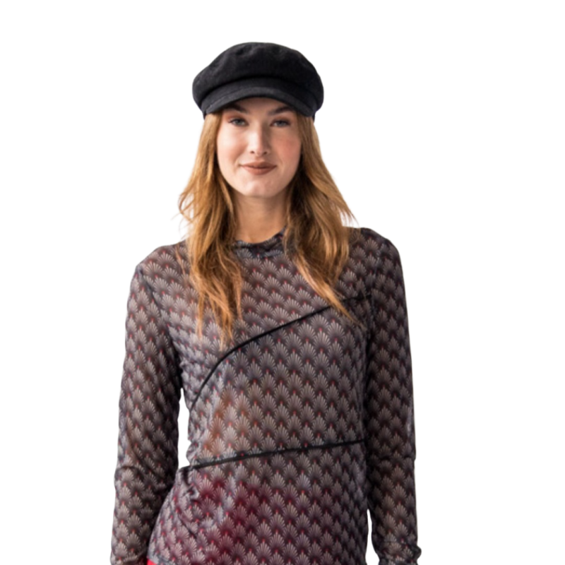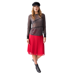 Camiseta de manga larga semitransparente con fondo negro y dibujo geométrico. Ideal para ir debajo de un pichi, mono o americana.