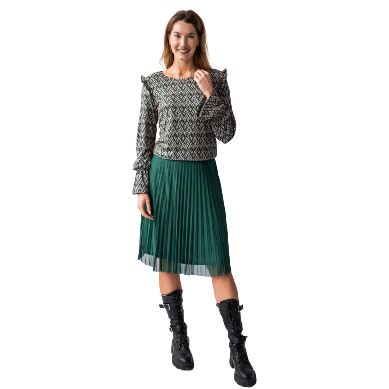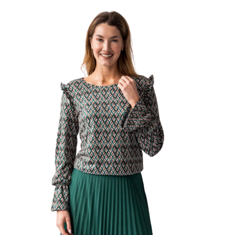 Camiseta de punto con cuello redondo, detalles en mangas y estampado geométrico. Puedes combinarla con pantalones o faldas.