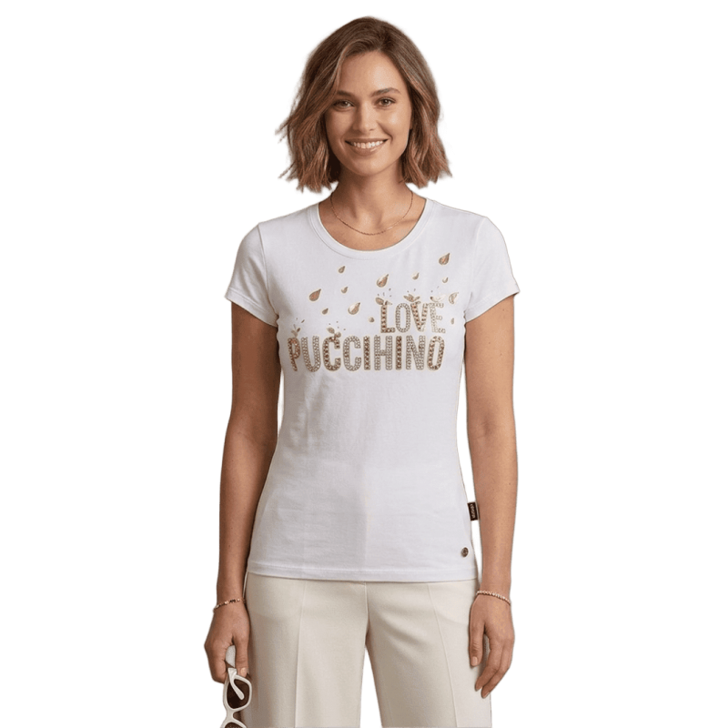 Camiseta PUCCIHINO blanca con letras en pedrería en la parte central y toques en dorado, cuello redondo y manga corta. La camiseta es ideal para combinarla con faldas, pantalones y jeans. Estilo sport chic.