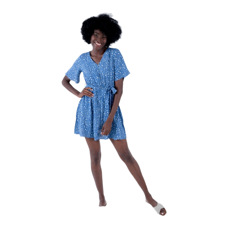 Vestido LYLU Rosabra estilo camisero hasta la cintura y con manga corta. El vestido azul con estampado en topos blancos super original, dispone de cinturón. Un vestido muy cómodo y llevadero ideal para esta nueva temporada primavera-verano.