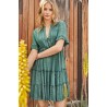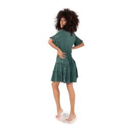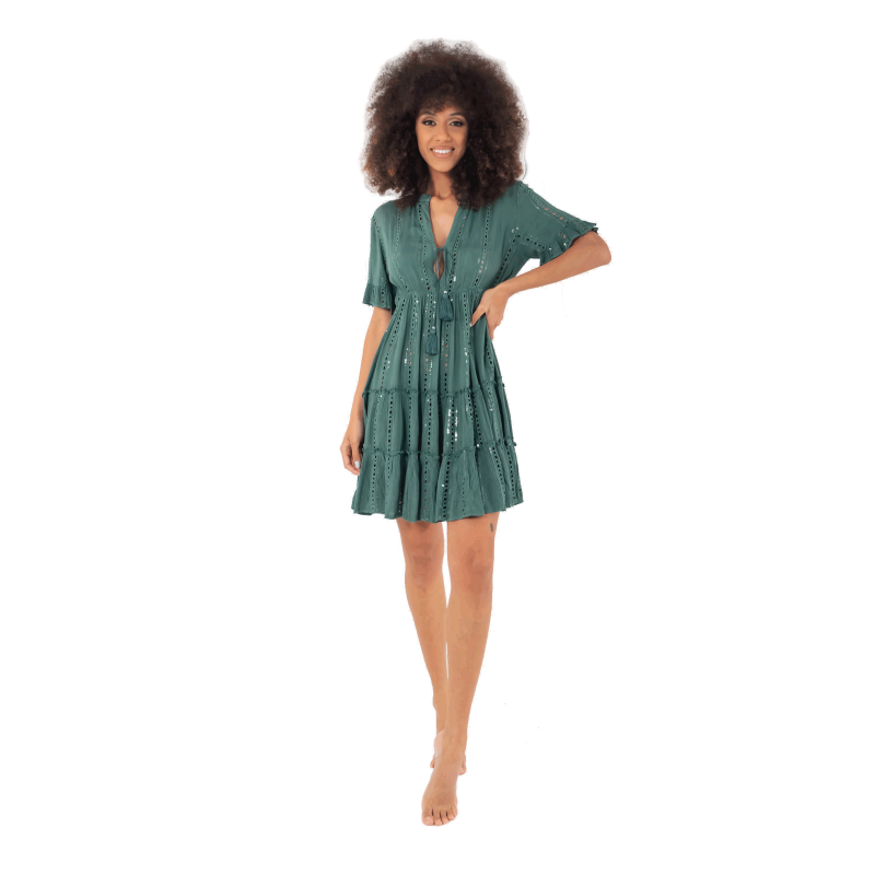 Vestido ICONIQUE Ruby en manga corta, el vestido es verde botella con detalles bordados y pequeñas lentejuelas. El vestido es de cuello mao y cerrado con cordón haciendo del mismo un vestido diferente y a la vez original para esta nueva temporada primavera-verano. El vestido es corto, un vestido ideal y llevadero.