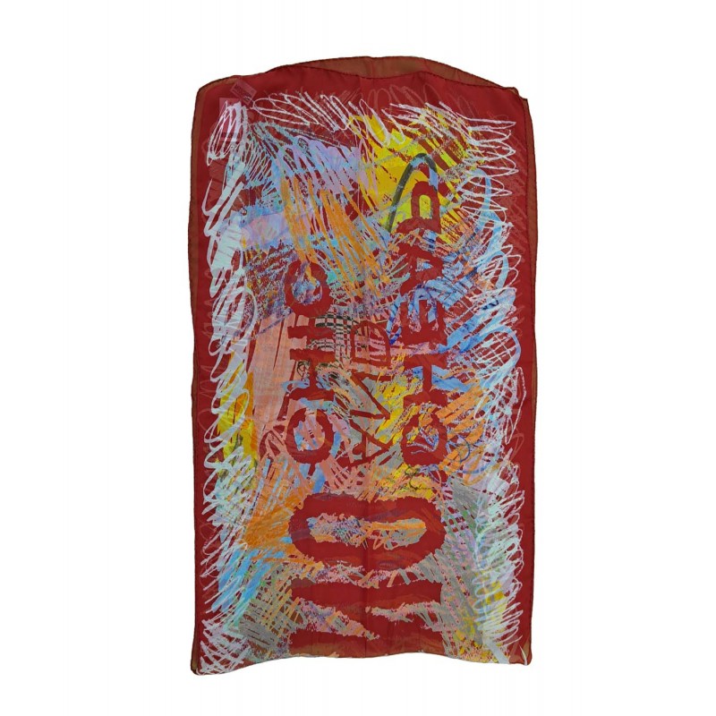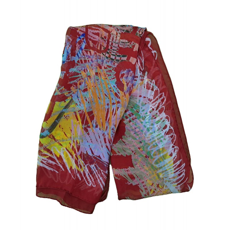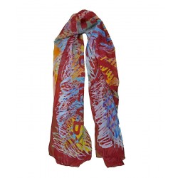 Foulard 100% seda MOSCHINO en color rojo y print de diferentes colores, el logo de la marca ocupa todo el foulard haciendo del mismo una pieza muy original. Un básico para este invierno.