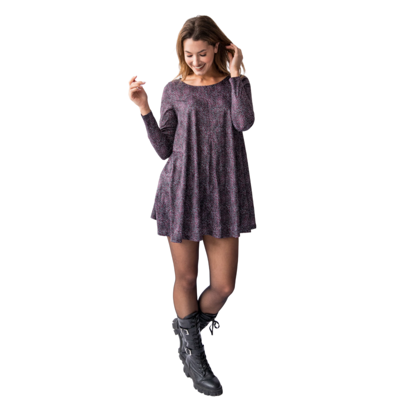 Vestido de manga larga, escote redondo, fondo negro y estampado con topitos pequeños de diferentes colores.