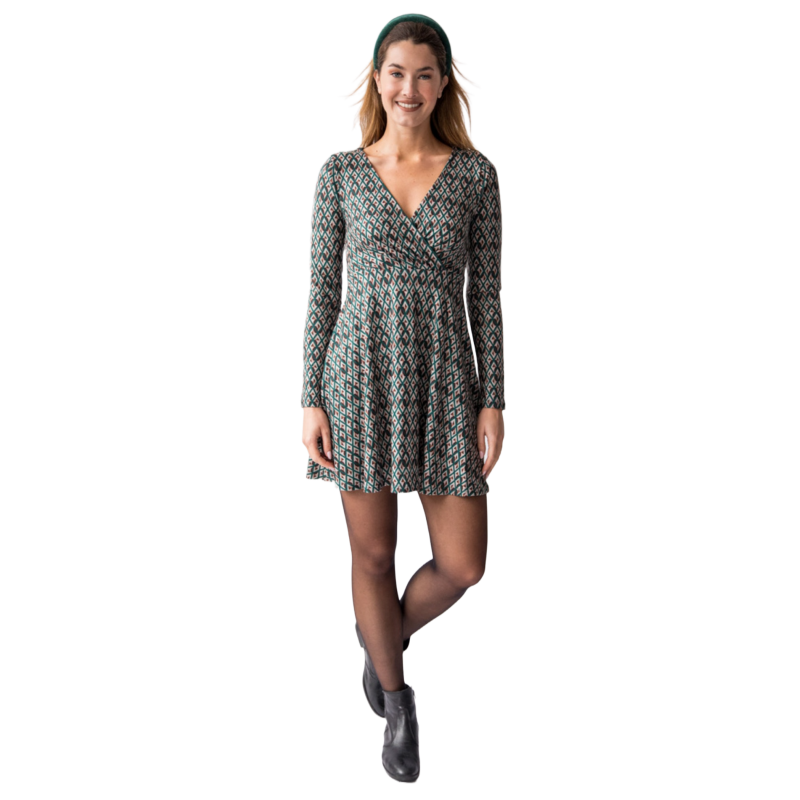 Vestido de punto de manga larga y escote en pico, en estampado geométrico en verde.