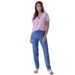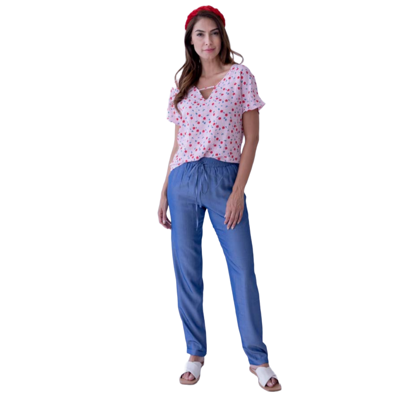 Pantalones LYLU rectos lisos de color azul, color super de moda esta primavera-verano. Se ajustan a la cintura con goma y lazo. Unos pantalones cómodos ideales para combinarlos con camisetas de la misma marca a juego con los pantalones.