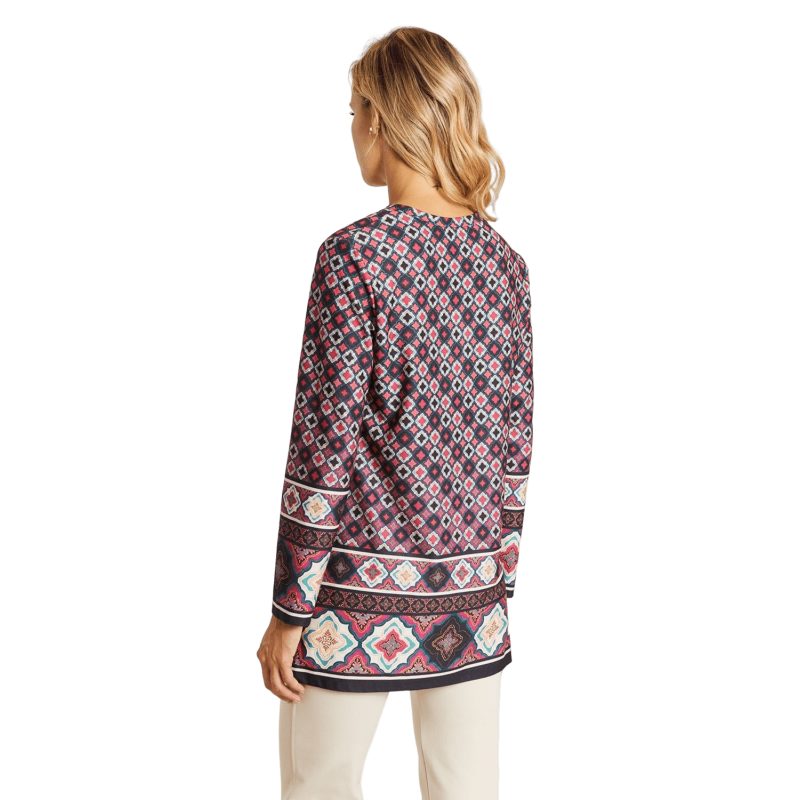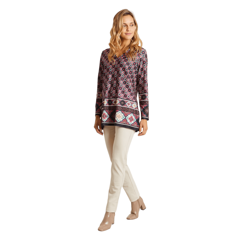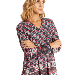 Camiseta ANNA MORA estampado Zellige. Es una camiseta estampada con cuello pico y ligeramente abierta en los lados. Lleva collar de conjunto super original. Una camiseta muy cómoda e ideal para combinarla con cualquier pieza.