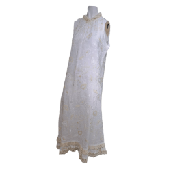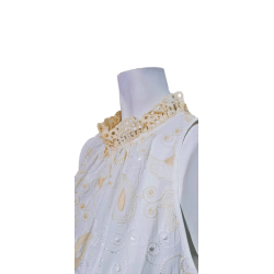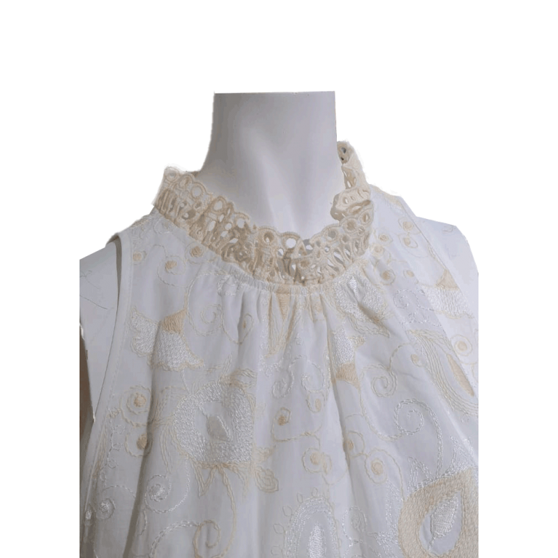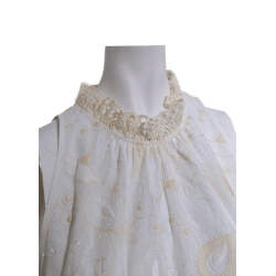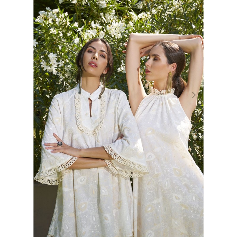 Vestido LFDL con cuello halter en color blanco y dibujo de cachemir en color crudo, cierre con botón en la parte trasera del cuello. Un vestido ideal para esta nueva temporada. Estilo sport chic.