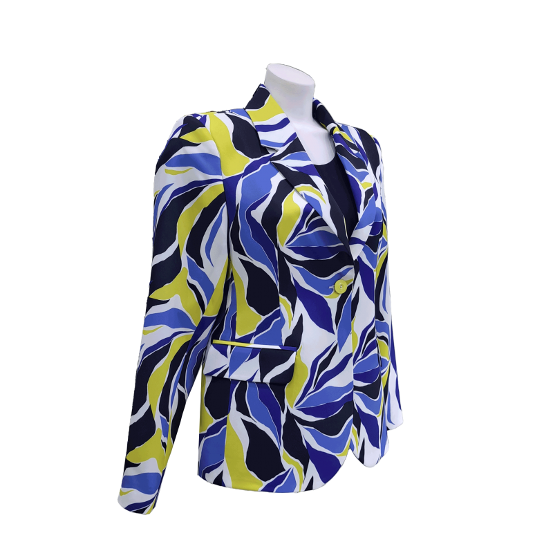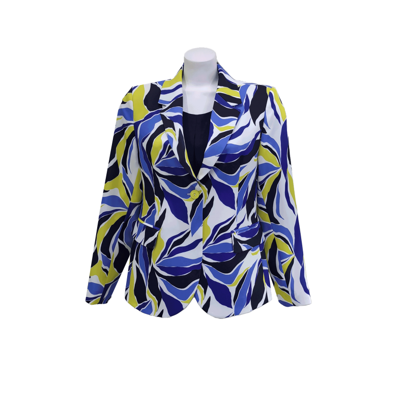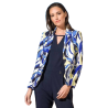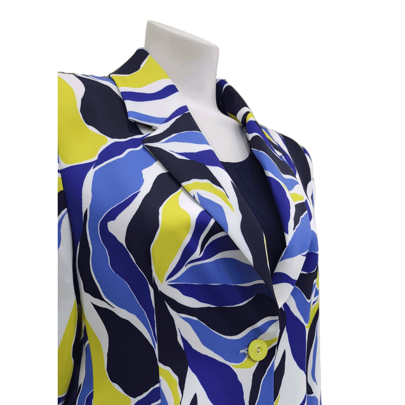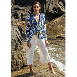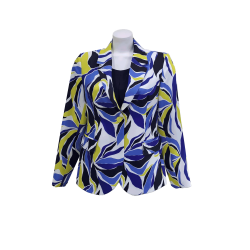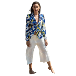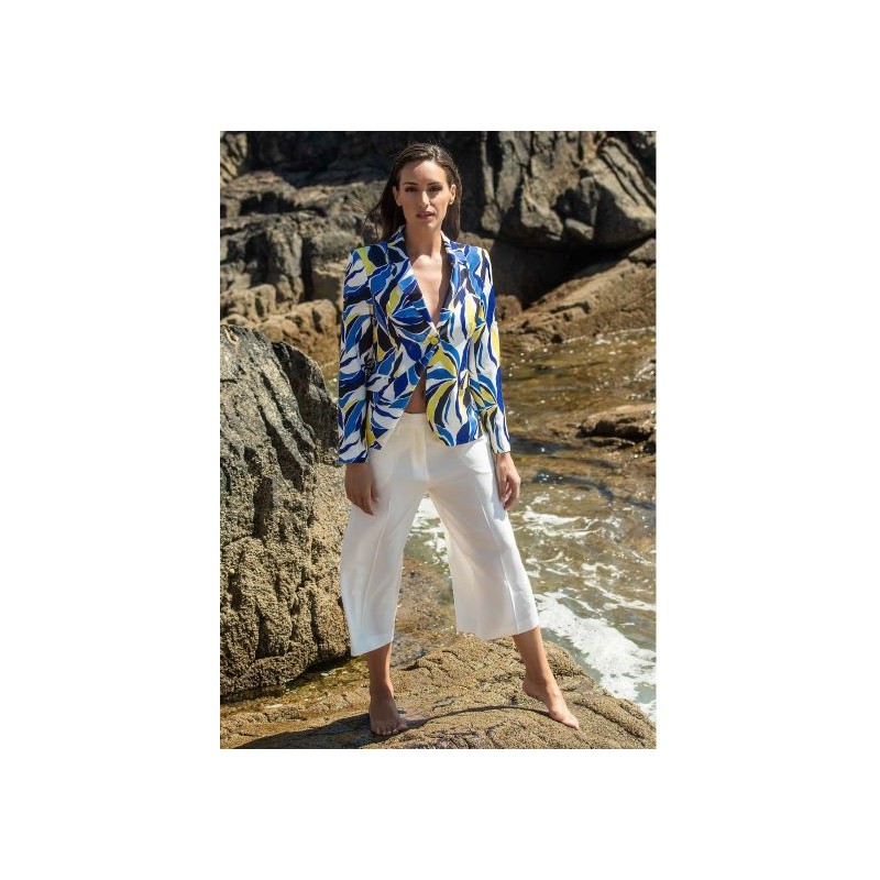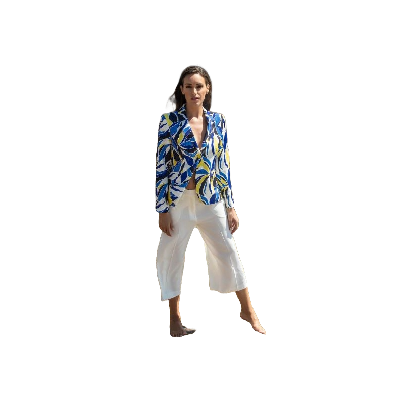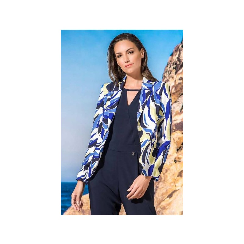 Americana SCUSI con estampado floral en tonos azules y amarillo. La americana ideal para combinarla con vestido a conjunto. Una americana muy cómoda y llevadera ideal para esta nueva temporada primavera-verano.