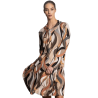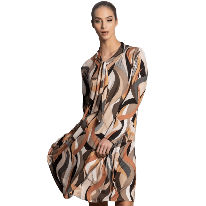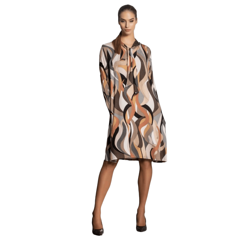 Vestido SCUSI estampado ochentero en tonos marrones y tierra. El vestido es largo con cuello de pico y rematado con cinta para anudar haciendo del mismo una prenda super original. El vestido es de manga larga y consta de dos bolsillos. Un vestido ideal tanto para un estilo sport como más formal, ideal para combinarlo con americana o chaqueta. Un básico para este otoño-invierno.
