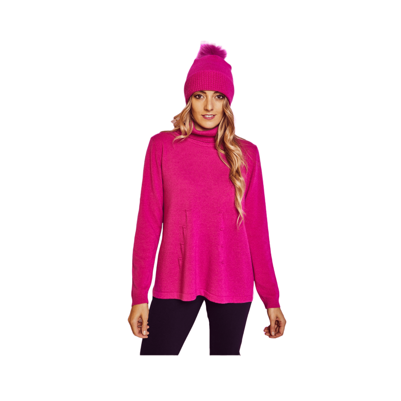Jersey de cuello cisne MOU liso en color fucsia, manga larga y detalles en la parte delantera. El jersey es ligeramente amplio, ideal para combinarlo con faldas o pantalones. Apuesta por uno de los colores claves de esta nueva temporada otoño-invierno.