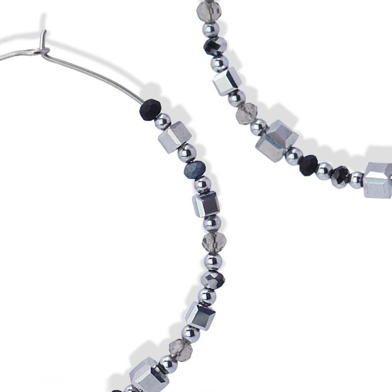 Pendientes de acero quirúrgico con cuentas de cristai y piedra natural. Unos aros de estilo natural cargados de color y vitalidad. Disponible en 8 tonalidades tendencia. Miden 45 mm de diámetro. Hipoalergénicos.
