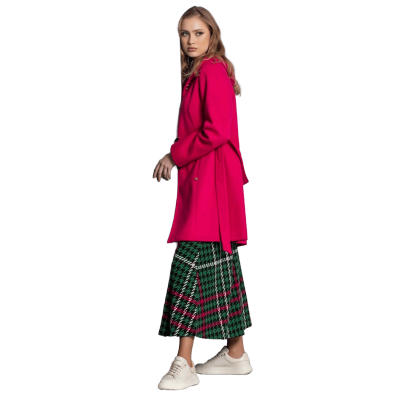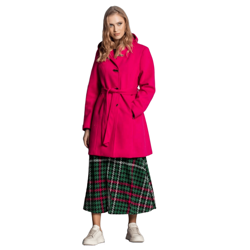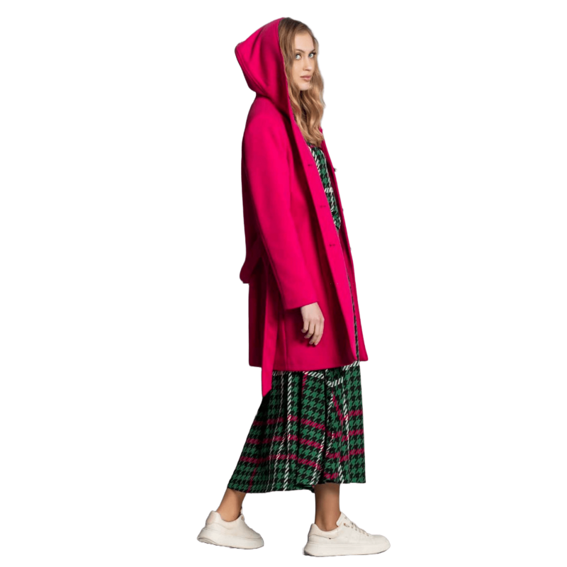Abrigo SCUSI liso en color fucsia o naranja. El abrigo es tipo ochentero, con capucha y cinturón y cierre con botones, consta también de dos bolsillos. Un abrigo ideal para esta nueva temporada otoño-invierno.