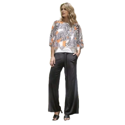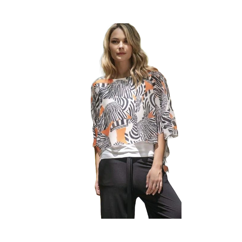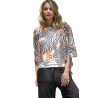 Blusa dos piezas superpuestas SCUSI con dibujo geométrico, cuello redondo y manga corta. La blusa es ligeramente más larga en la parte trasera. La camiseta es ideal para combinarla con faldas o pantalones. Estilo sport chic.