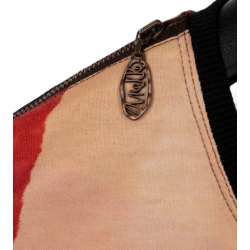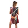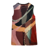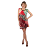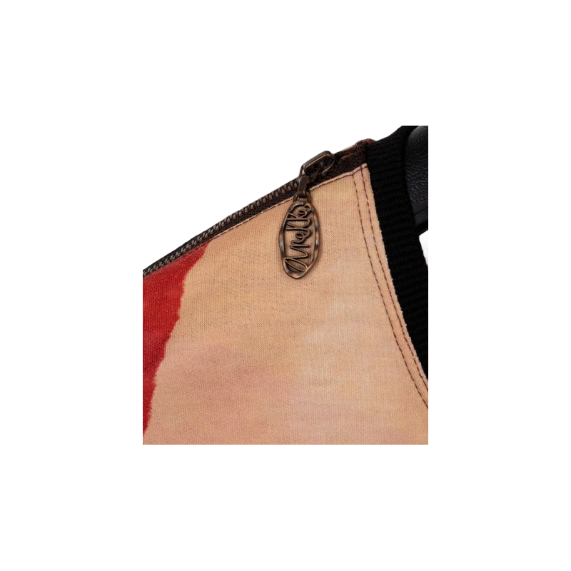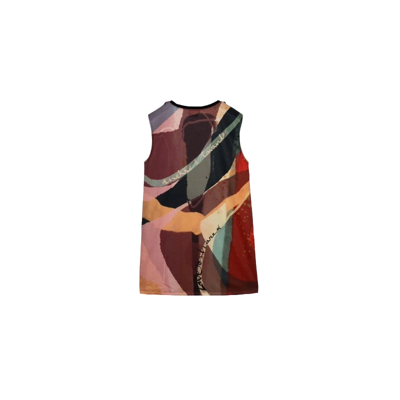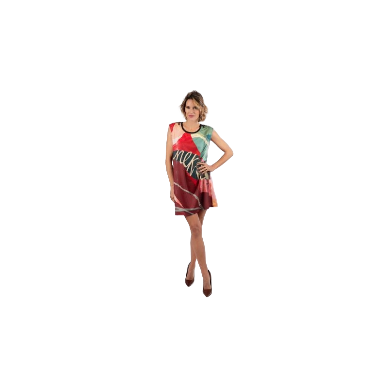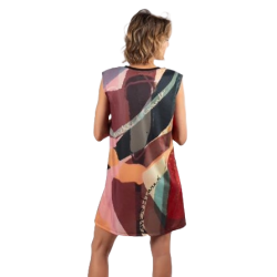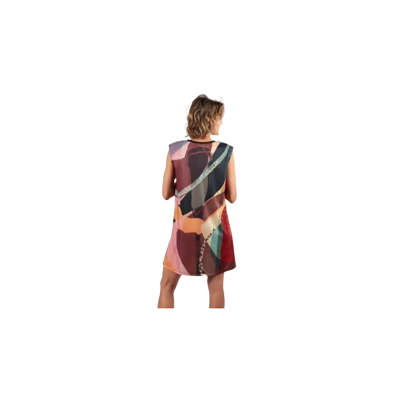 Este vestido corto es desmangado y tiene cuello redondo, con ribete azul marino. El original diseño multicolor combina diferentes tonos, con originales detalles como los hombros con cremallera o la textura que rodea al logo.