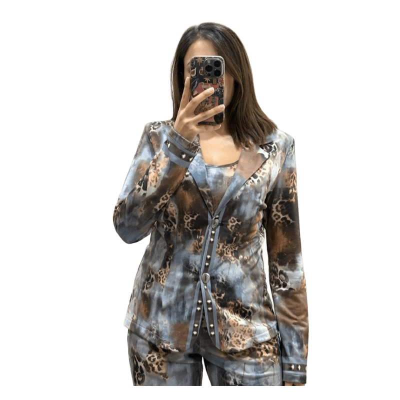 Americana estampada animal print multicolor en tonos marrones y grises MISSY. La americana de manga larga y cierre con dos botones, en la parte trasera consta de detalles en pedrería, estampado multicolor haciendo de la misma una americana ideal para el día a día. Una americana sport chic ideal para esta temporada.