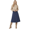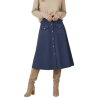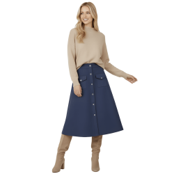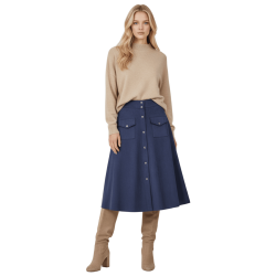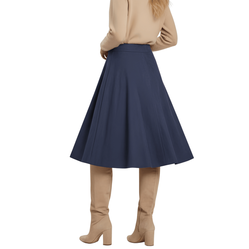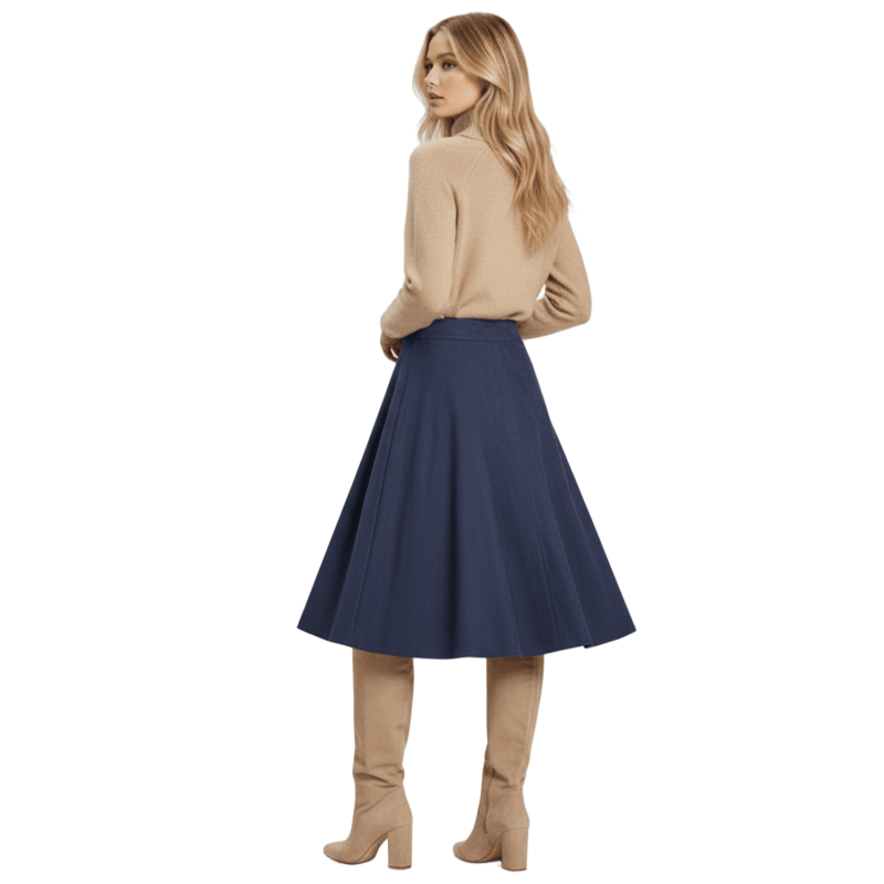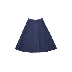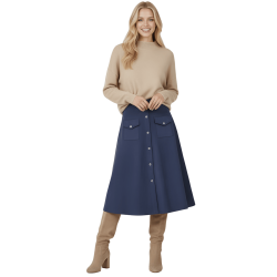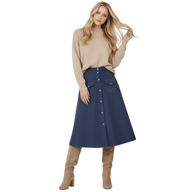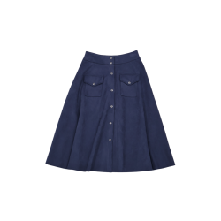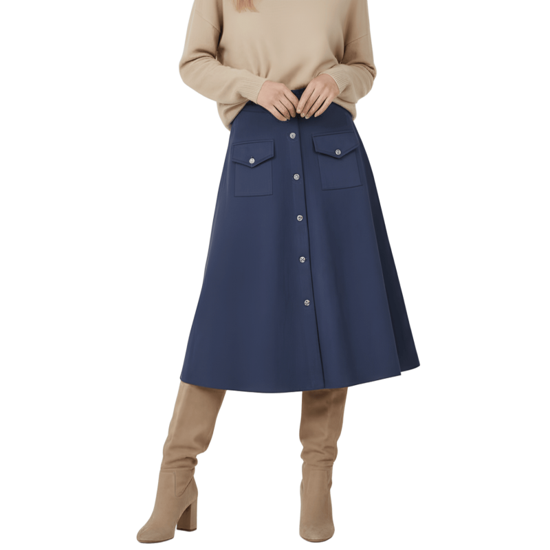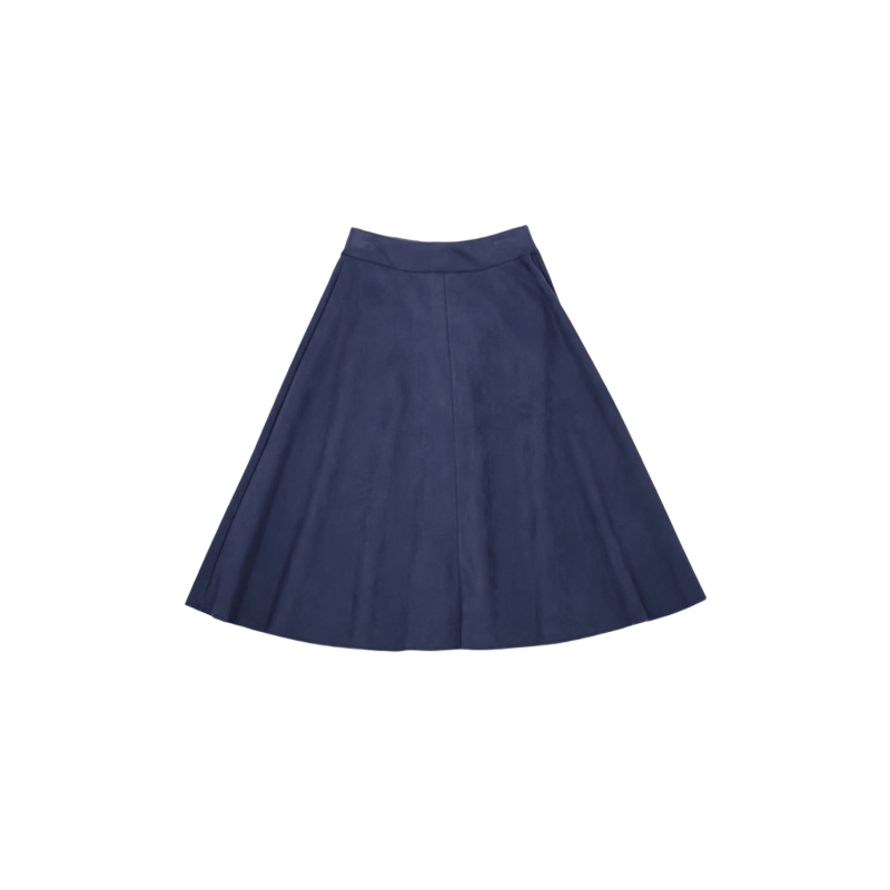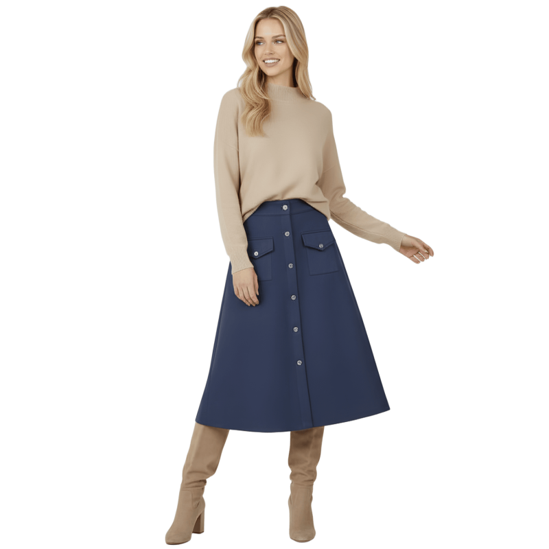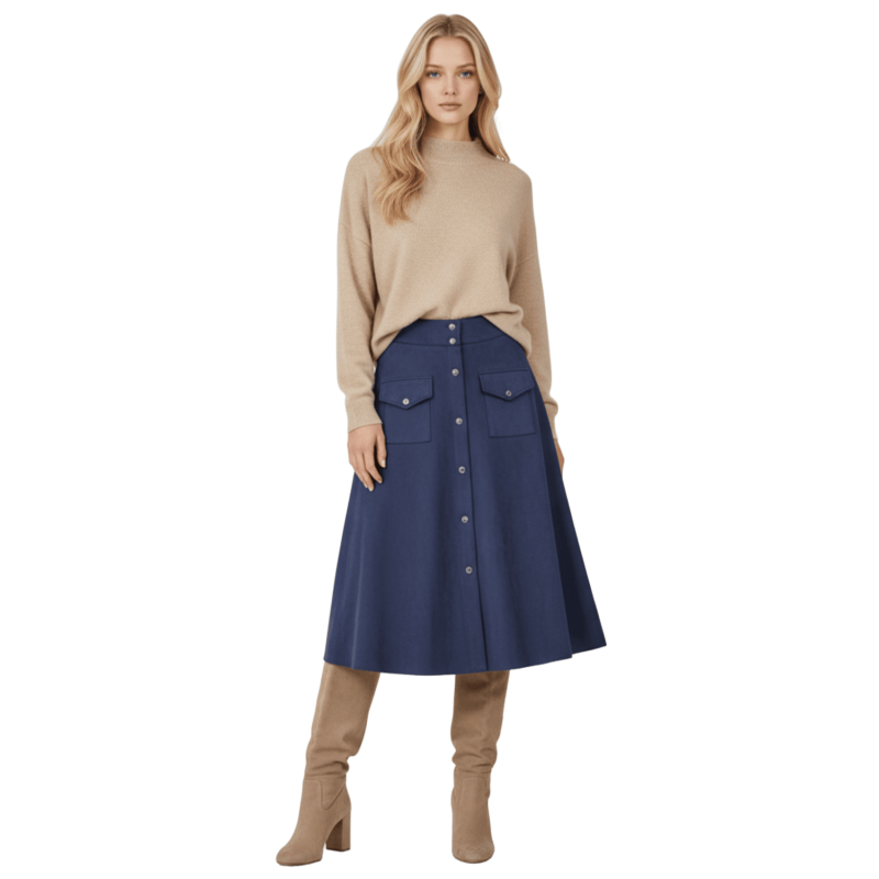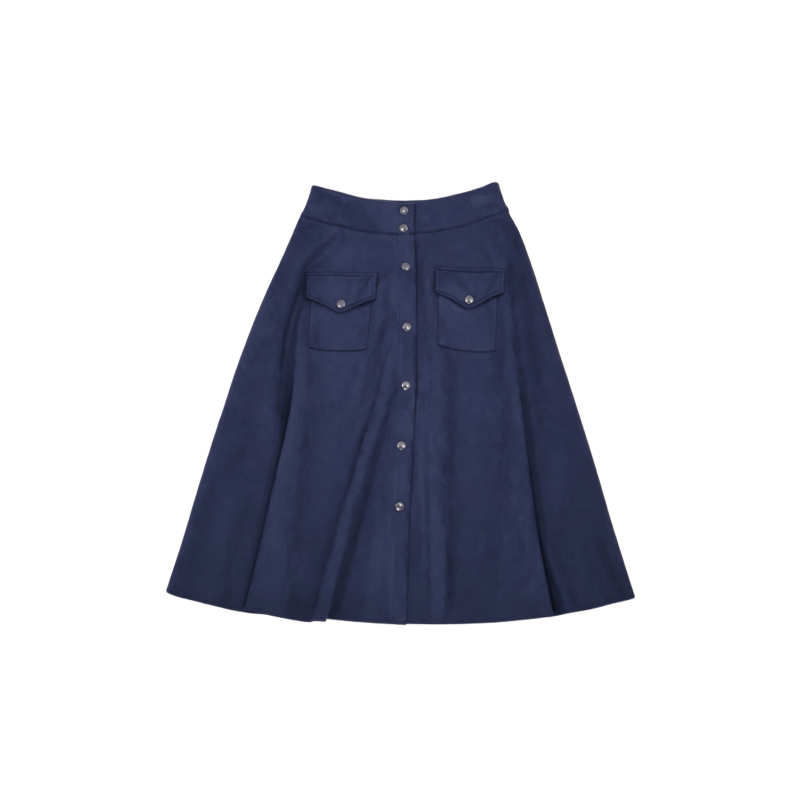 LOLITAS Falda azul oscuro piel melocotón con automáticos. Tacto suave, estilo impecable y esos bolsillos (¡sí, funcionales!) que te salvan la vida. Una prenda única que no puede faltar en tu armario.