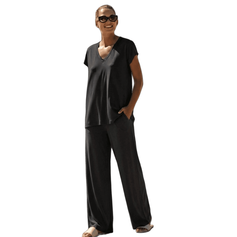 Camiseta lisa en punto de seda SCUSI. Un pantalón polivalente dependiendo de los complementos. Puedes combinarla con su pantalón a juego. Podrás ir a un evento o a una salida informal. Ideal para esta nueva temporada primavera-verano.