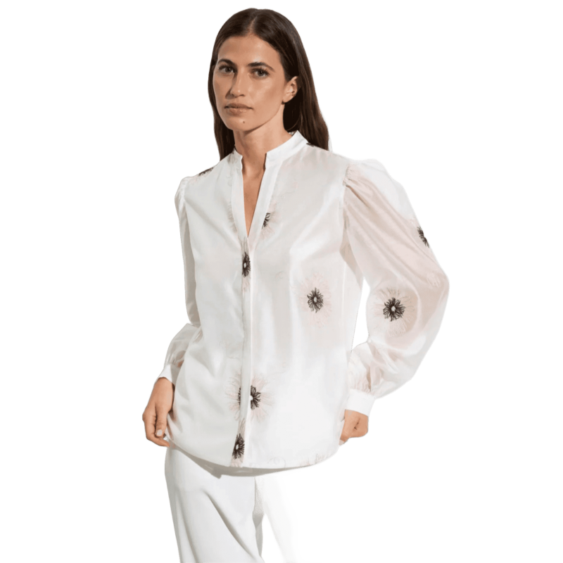 TINTA & BARILOCHE Blusa de tejido satinado. Manga larga ligermanete abullonada terminada en puño. Cuello mao. Bordados florales de gran tamaño en negro y beige. Escote con abertura central. Cierre frontal oculto bajo tapeta. Bajo recto.TALLAJE: