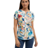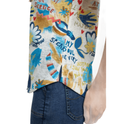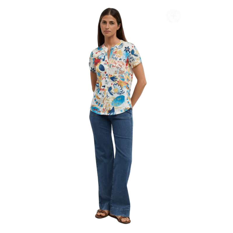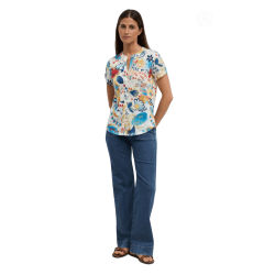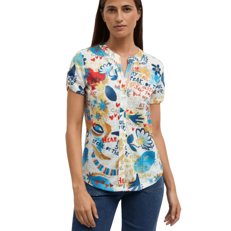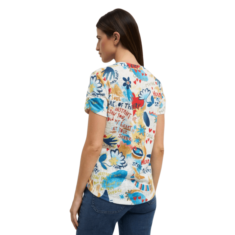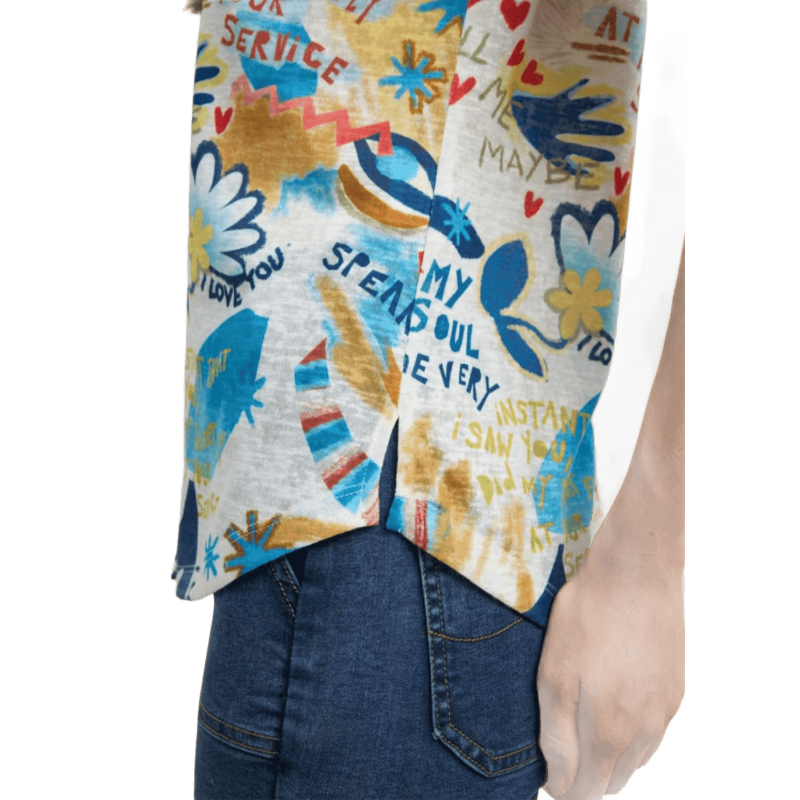 TINTA & BARILOCHE Camiseta de manga corta con ligero fruncido lateral. Cuello mao. Estampado artístico con mensajes y motivos abstractos. Escote en V. Cierre frontal con botones. Bajo redondeado.TALLAJE: