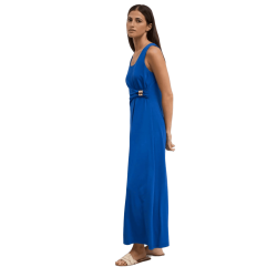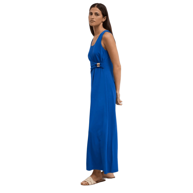 Vestido largo TINTA & BARILOCHE sin mangas. Cuello redondo. Fruncido lateral con hebilla metálica decorativa en dorado. Corte amplio entallado en la cintura. Bajo recto.TALLAJE: