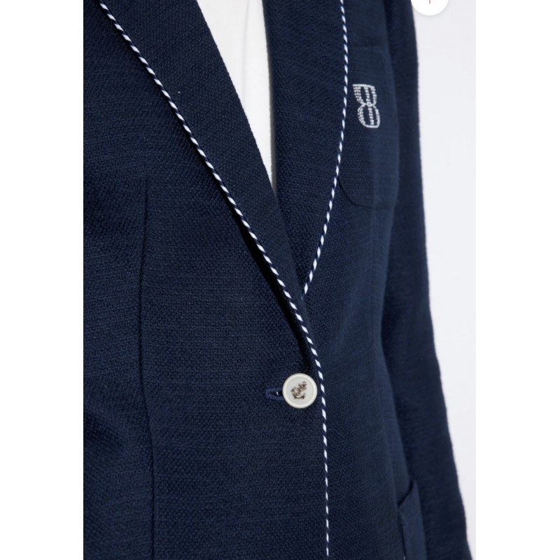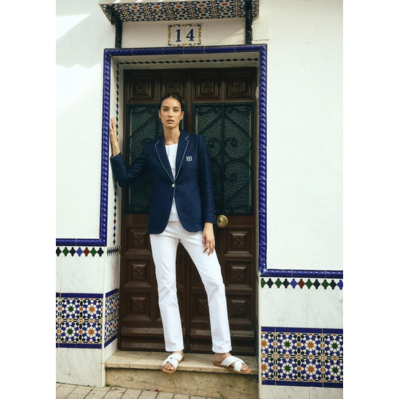 TINTA & BARILOCHE Blazer entallada lisa. Cuello con solapa de muesca y detalle de ribete estampado. Cierre frontal con un botón joya. Manga larga con botones coordinados. Tres bolsillos frontales de parche, unos con detalle de monograma de pedrería. Largo a la cadera. Bajo recto con extremos redondeados.