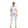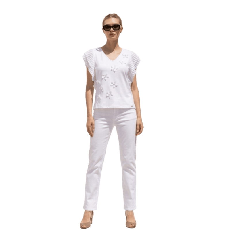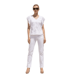 Camiseta de algodón con detalles florales al tono y pedrería SCUSI. Una camiseta muy chic para combinarla con jeans o con pantalones de vestir. Una camiseta para ser la reina de la fiesta esta nueva temporada primavera-verano.
