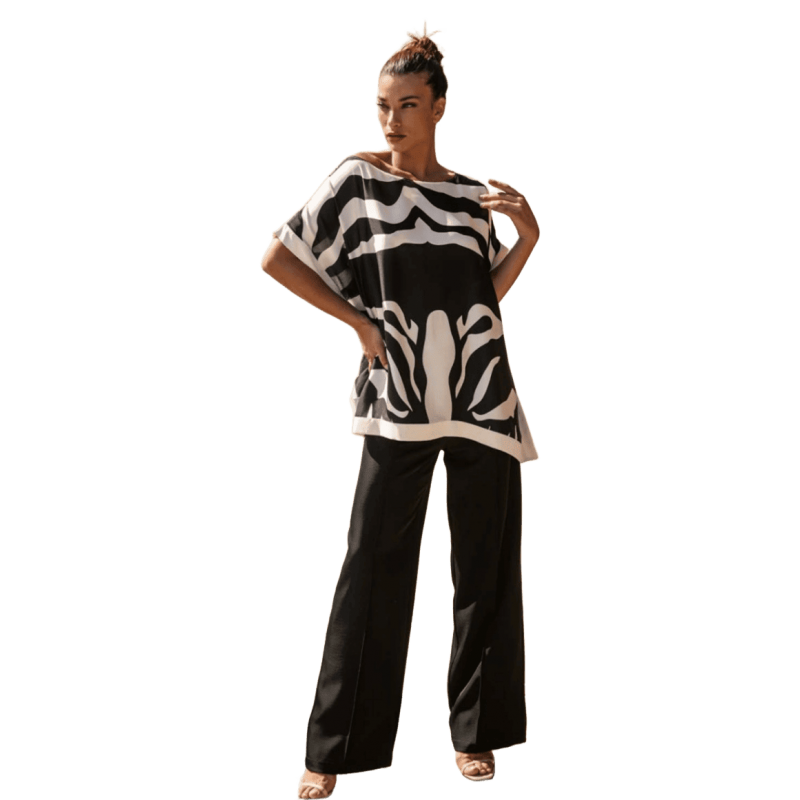 Blusa / Camisola estampado cebra SCUSI. Una blusa elegante para combinar con su pantalón a juego o con uno liso negro. Ideal para esta nueva temporada primavera-verano.