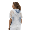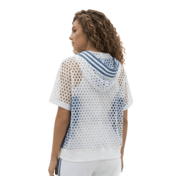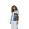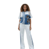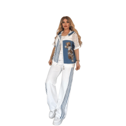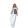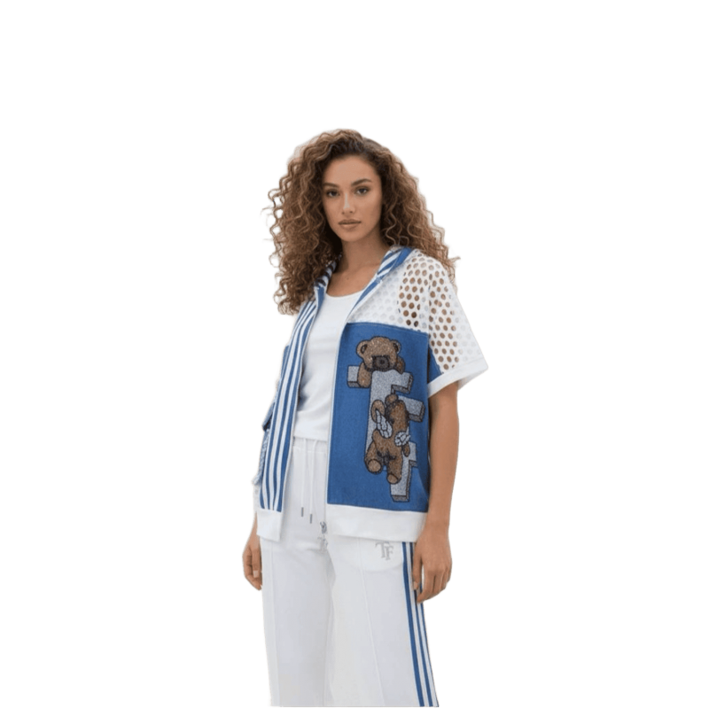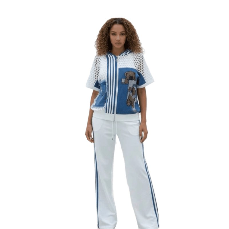 Conjunto TATU de 3 piezas, compuesto de top, chaqueta y pantalón. El pantalón es ancho con goma en la cintura e incorpora unas rayas en el lateral. La chaqueta es de manga corta y combina tela, red de tela y parches en jean con detalles en pedrería (ositos). El top es ajustado y sin mangas en color blanco. Un conjunto Sport-chic.