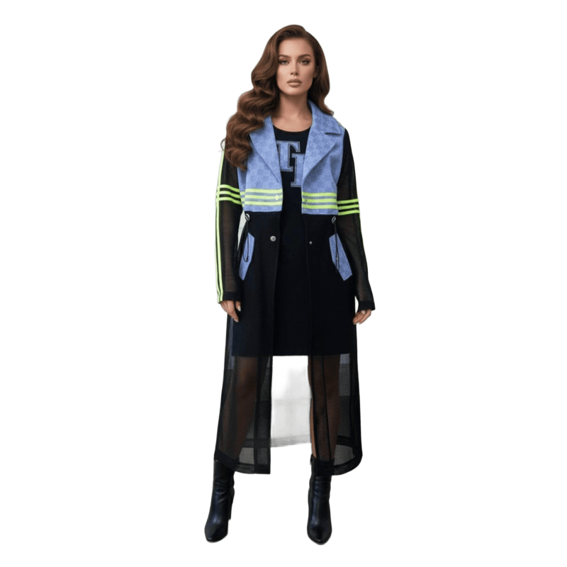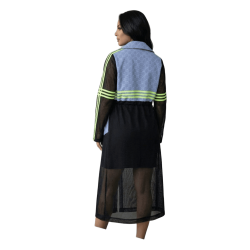Conjunto TATU de 2 piezas, compuesto de vestido ceñido con detalle en pedrería en el frontal y abrigo en red negra y detalles en color que es posible ceñir en la cintura. Un conjunto Sport-chic.